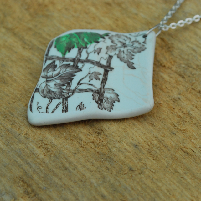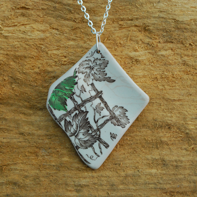 This piece of broken pottery we found on the beach is a classic example of old transferware. It has come from a serving platter by Copeland Spode called Spode Byron. Transfers were of only one colour - in this case brown. To add more colour to the china plate a second colour was applied by hand; in this case the green leaf. You can see how the green was added quickly and somewhat inexpertly as it doesn't really match the transfer. We have tumbled the pendant so it is rounded and smooth. Because the pottery has spent time in the water there is a faint pattern on the top right side of the pendant where the glaze is cracked, which we think adds to the feeling of history of the piece. This is a large eye-catching pendant with a beautiful design in vine leaves.