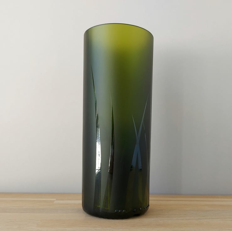 The slender column vase is a rich olive green glass in a cylindrical shape. I have given the glass an etched finish, leaving a sparkling design of a flight of butterflies among the long grass. The etched finish is permanent and has a protective coating to resist finger marks. As with most good wine bottles, this has a deep punt or dimple in the base.