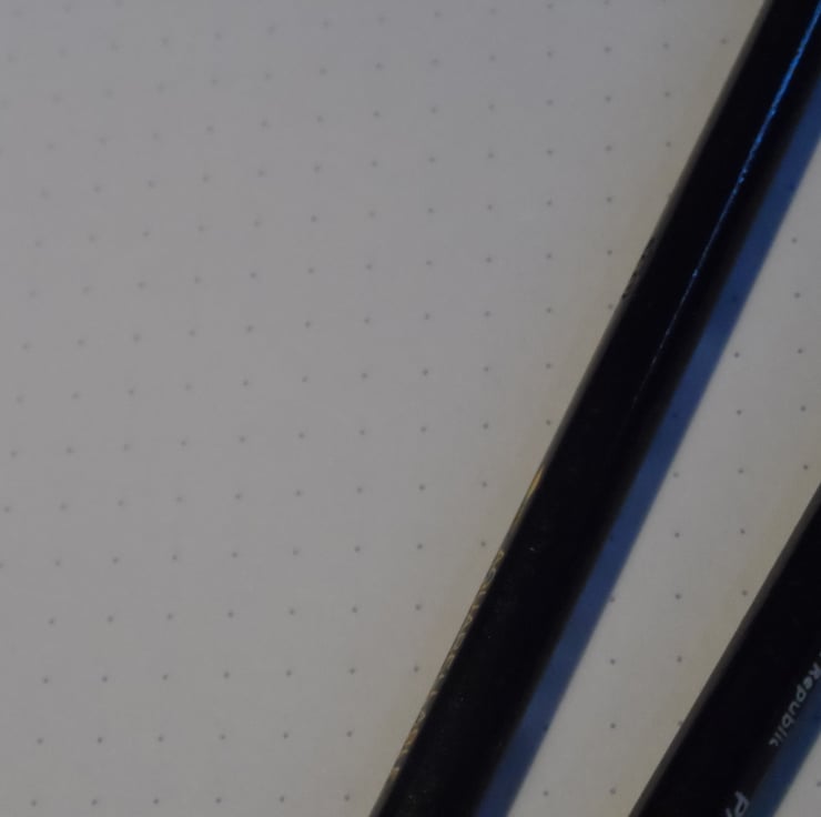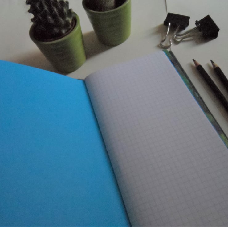 Booklet 3 - royal blue card cover with fold over pockets on both covers, and dot grid paper pages.