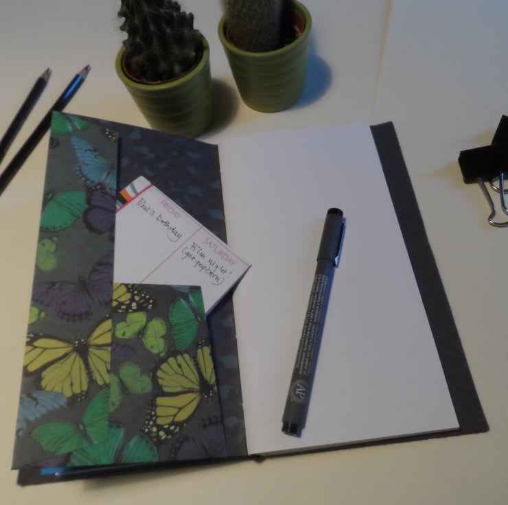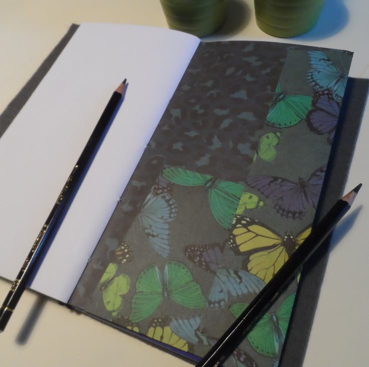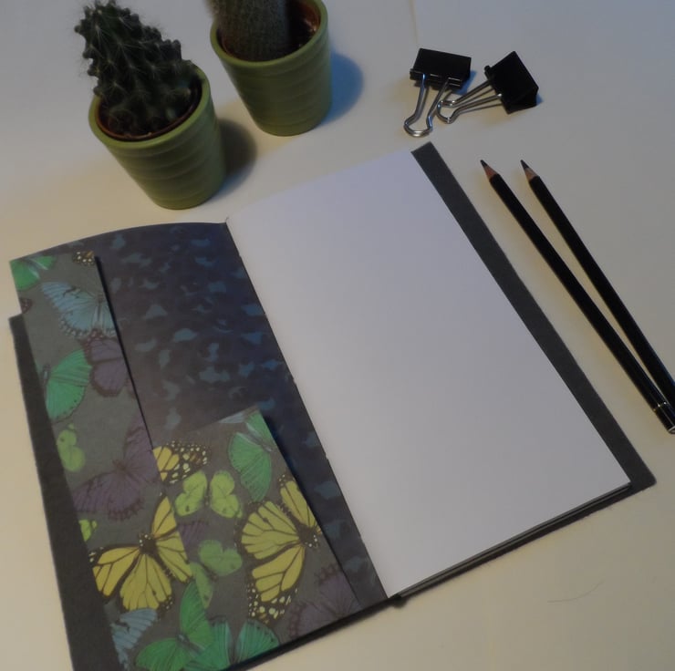 Booklet 2 - double sided printed card (butterflies on one side and an abstract pattern on the other side) with fold over pockets on both covers, and plain paper pages