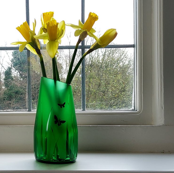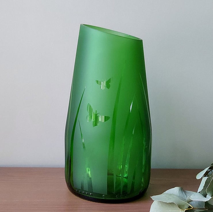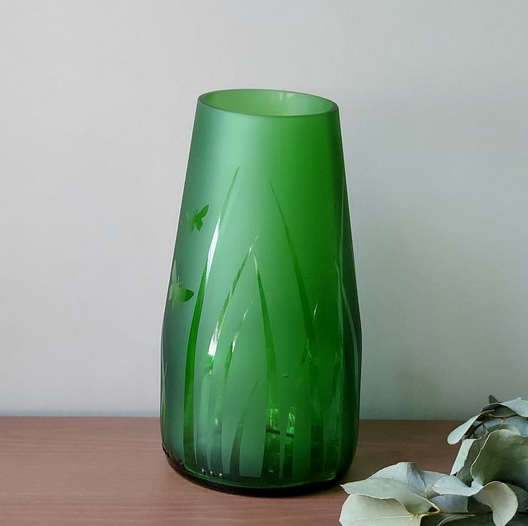 To create this recycled bottle vase, I cut the top off at an angle which complements the unusual tapering shape and ground it smooth, then sandblasted the surface, leaving clear a couple of butterflies flitting through the tall grass before sealing the surface with a protective coating.