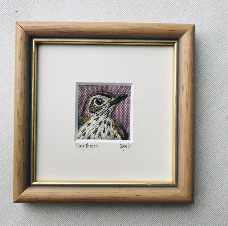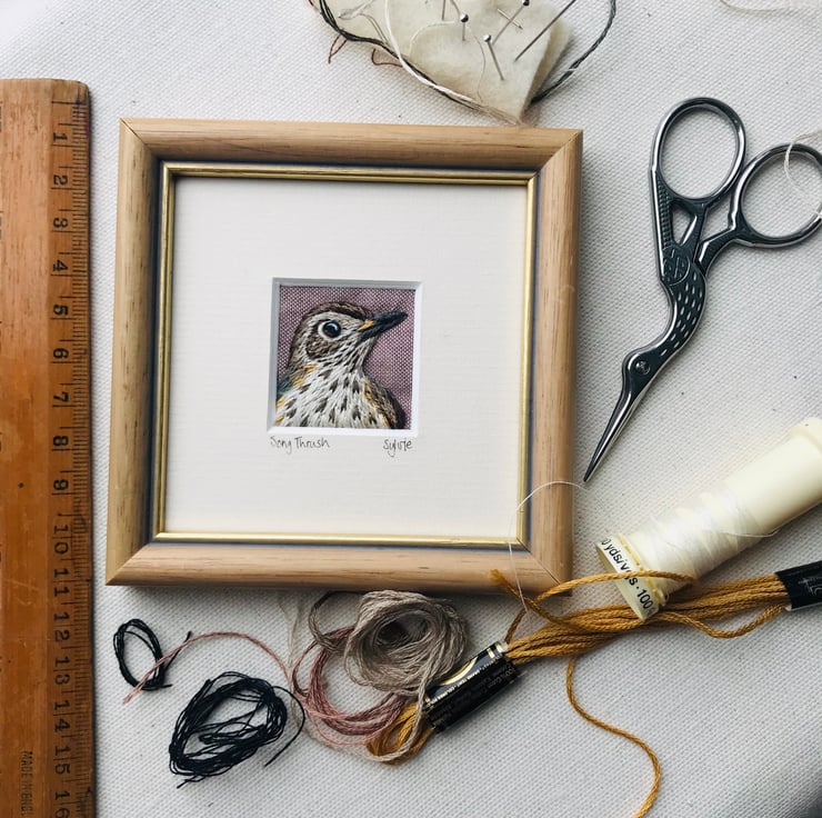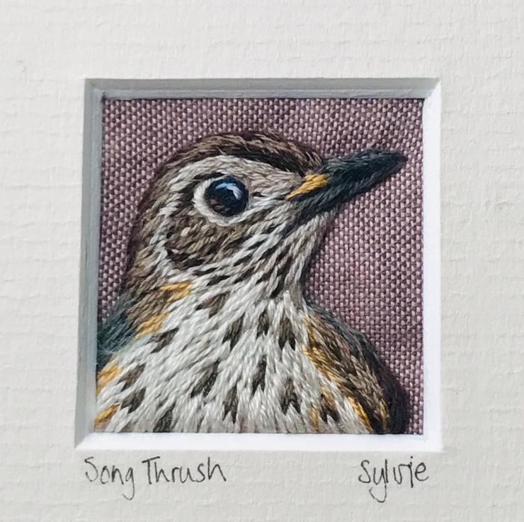 This little picture was stitched by hand with individual strands of thread onto a soft cotton background. The details of the arrow-shaped markings of the Thrush’s breast are clear, and the embroidery silks gleam and reflect the light making it look almost 3D. There’s a glint in the eye!