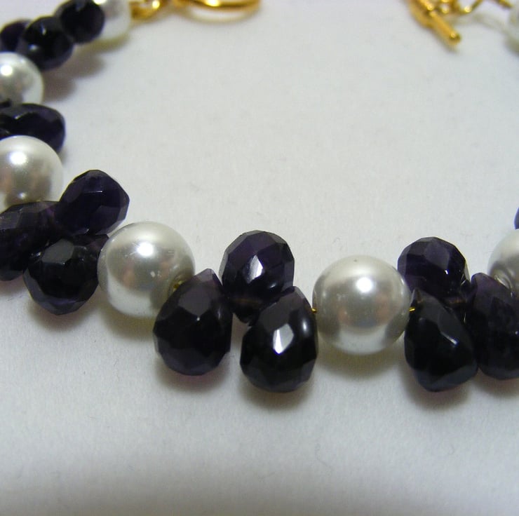 I've handmade this beautiful gemstone bracelet with, 5 x 8 mm amethyst faceted gemstone drops, 8 mm white glass pearls, gold plated findings and a gold plated toggle clasp. Amethyst is the birthstone for February. Bracelet is perfect for gifting.