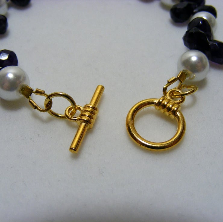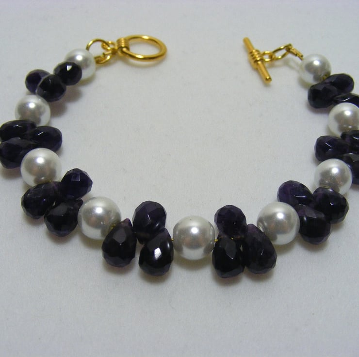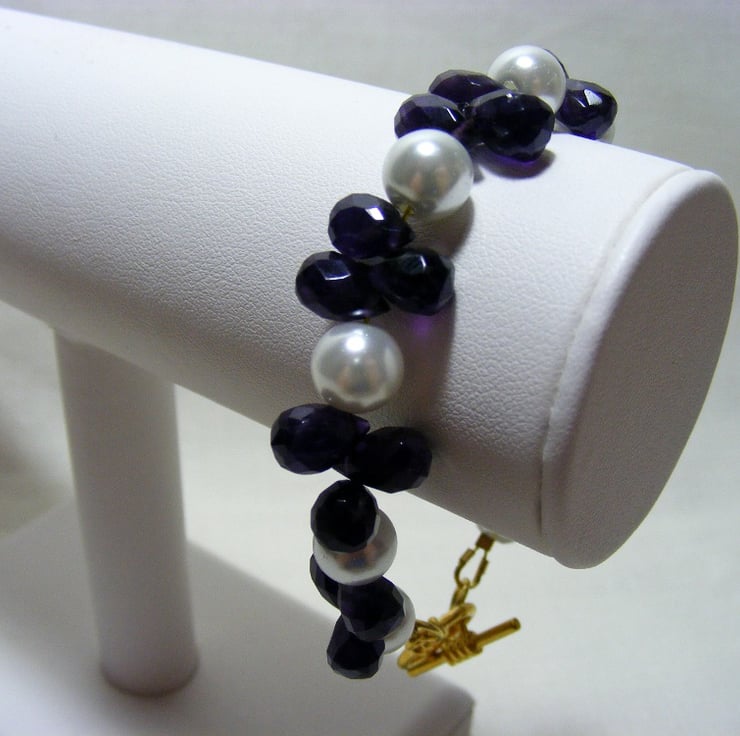 I've handmade this beautiful gemstone bracelet with, 5 x 8 mm amethyst faceted gemstone drops, 8 mm white glass pearls, gold plated findings and a gold plated toggle clasp. Amethyst is the birthstone for February. Bracelet is perfect for gifting.