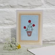 A hand-stitched card with the letter 'B' cut from pretty cotton fabric stitched into place with tiny stitches. I have added a miniature applique dove with heart in her beak, and then embroidered a tiny daisy flower to complete the design.