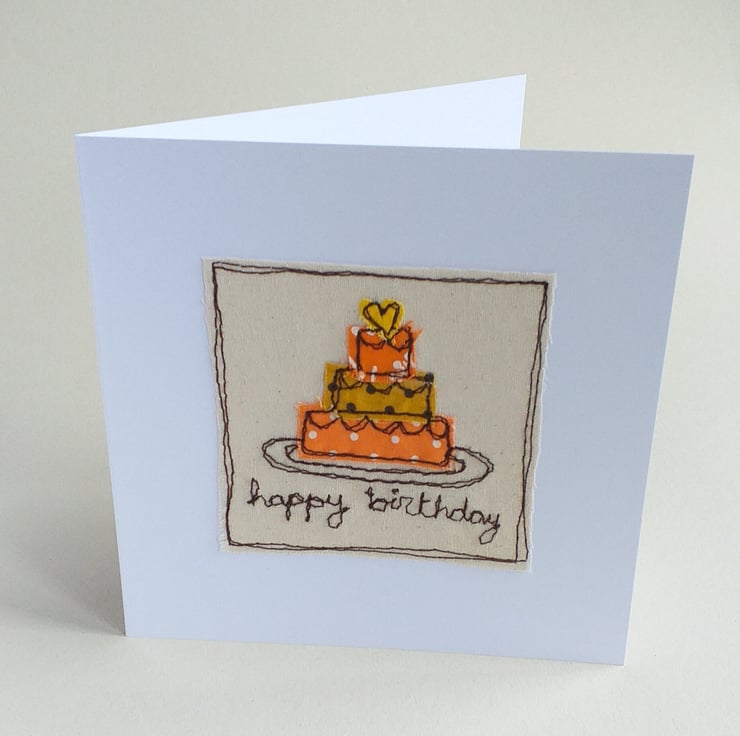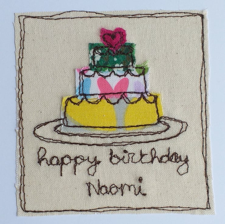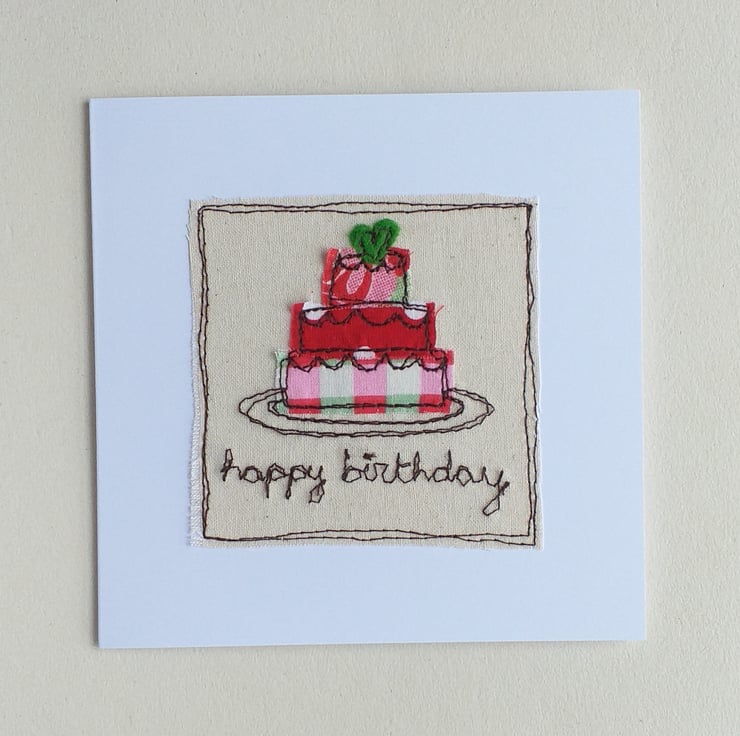 This white card features a 3 layer birthday cake in fabric scraps topped with a heart. It is stitched with freestyle machine embroidery, and says "happy birthday" on it. There is an option to specify fabric colours if you wish, though the particular fabrics will vary, or if you have no specific requirements, I will choose myself.