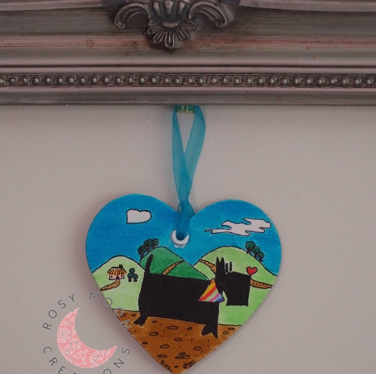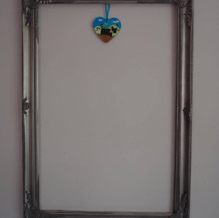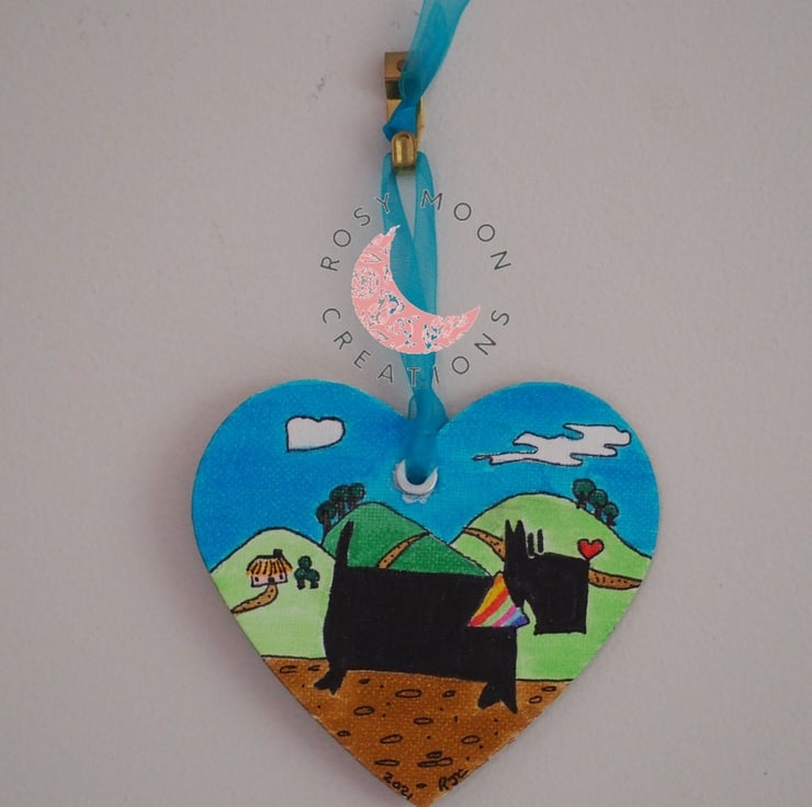This adorable Scottie Dog in a heart shaped canvas, is hand drawn and will look great on any wall.