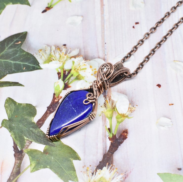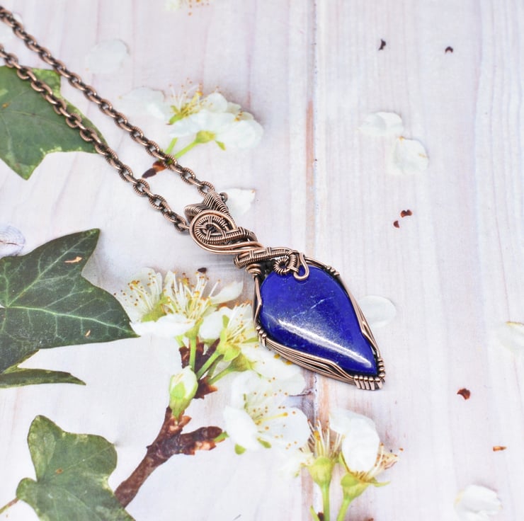 A lovely lapis lazuli I have wire wrapped in solid copper wire to make this unisex pendant.