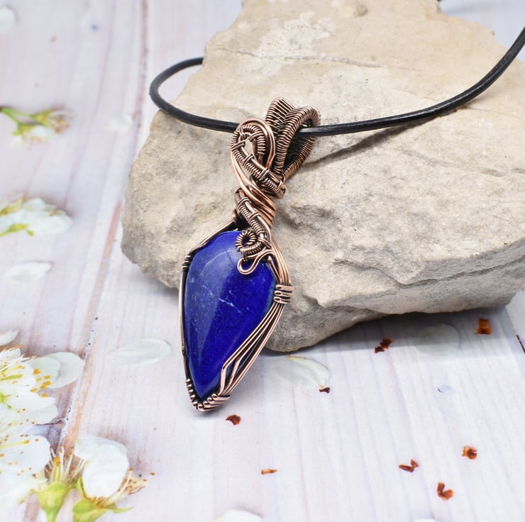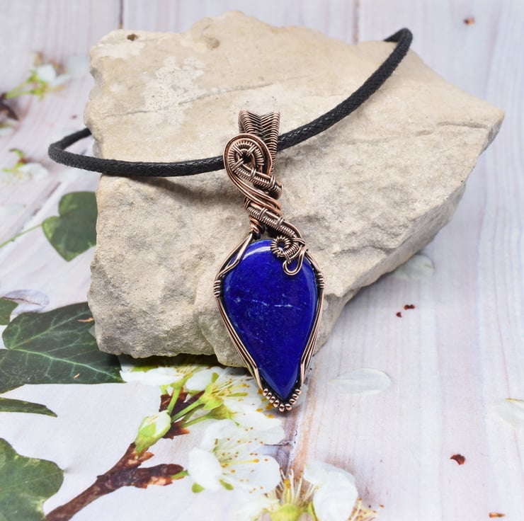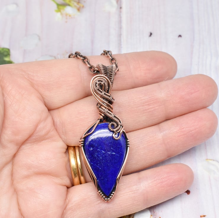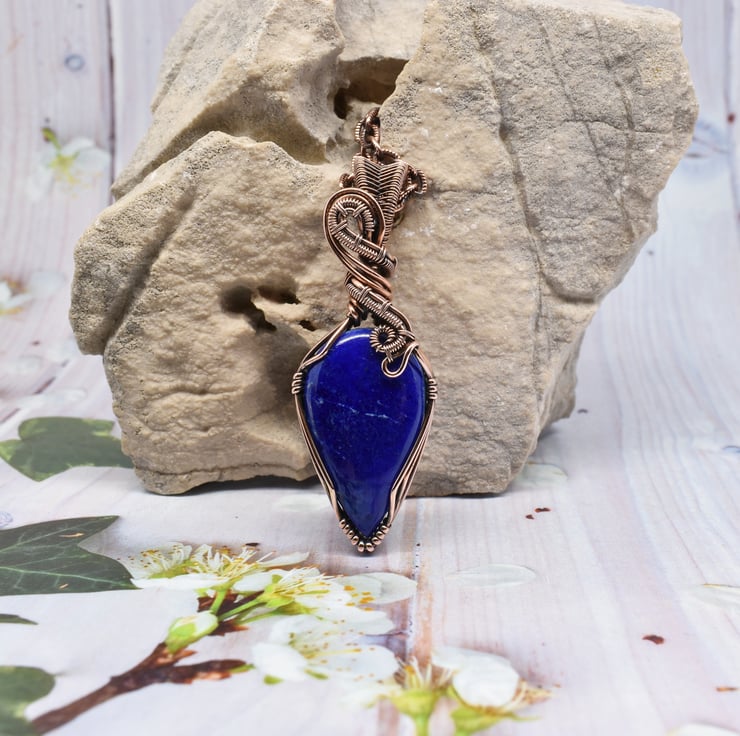 A lovely lapis lazuli I have wire wrapped in solid copper wire to make this unisex pendant.