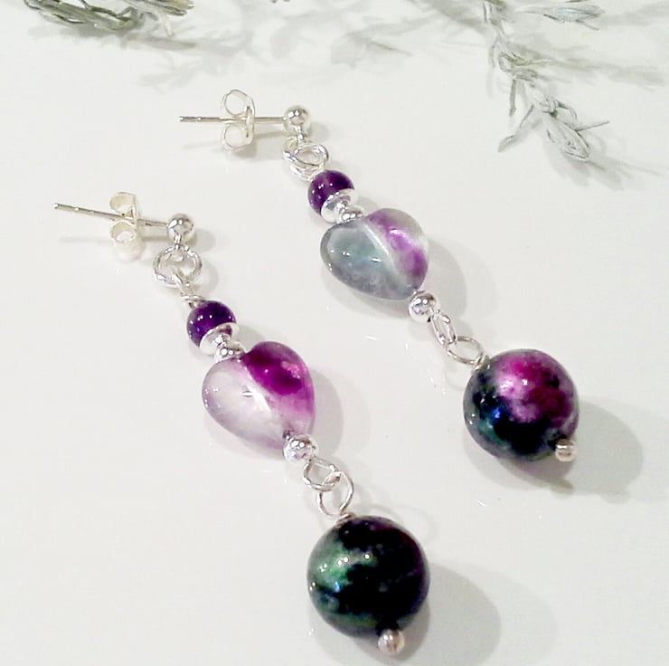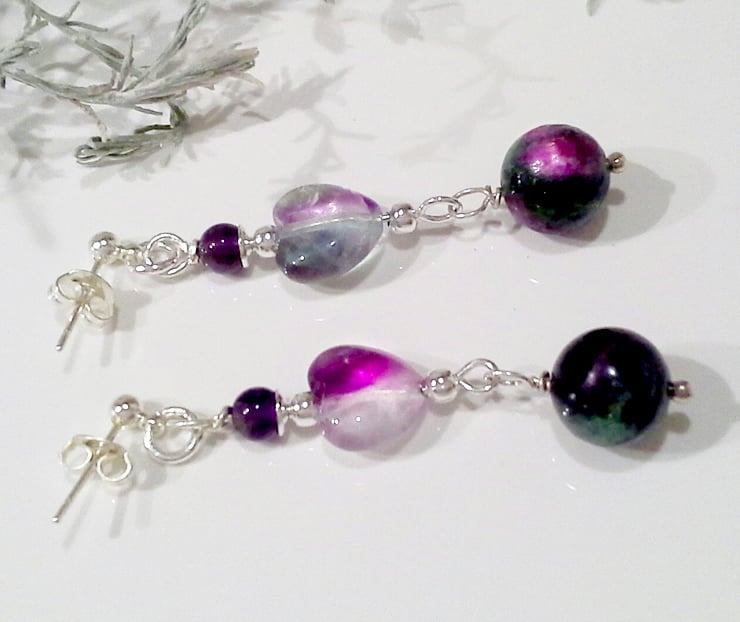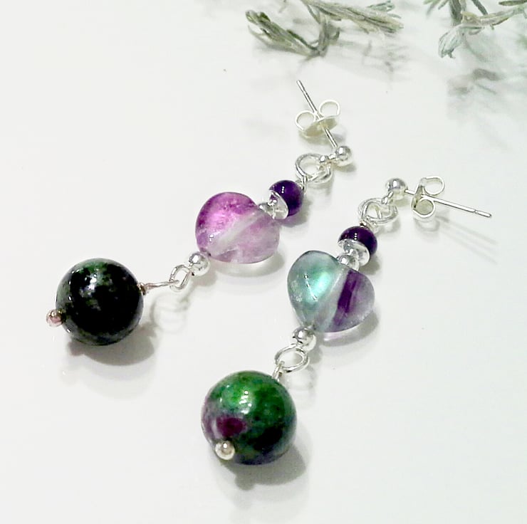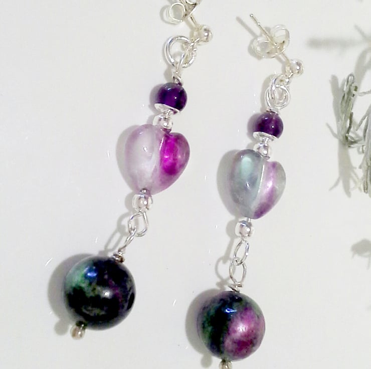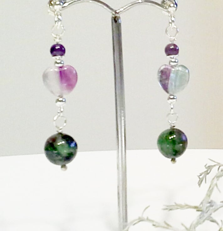 A lovely pair of expensive looking long dangle designs earrings hand crafted in Cornwall using 8mm puffy heart cut fluorite gemstones complimented with 8mm free dangling rare ruby Zoisite rounds and top quality 4mm ameythest rounds at the top. Both of the zoisite gemstone beads display distinctive ruby within them. Genuine ruby is found in zoisite mineral and mined from deep seams.