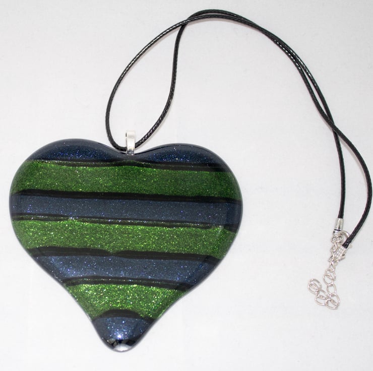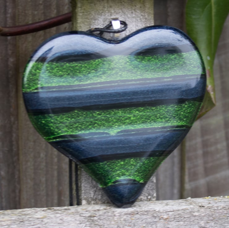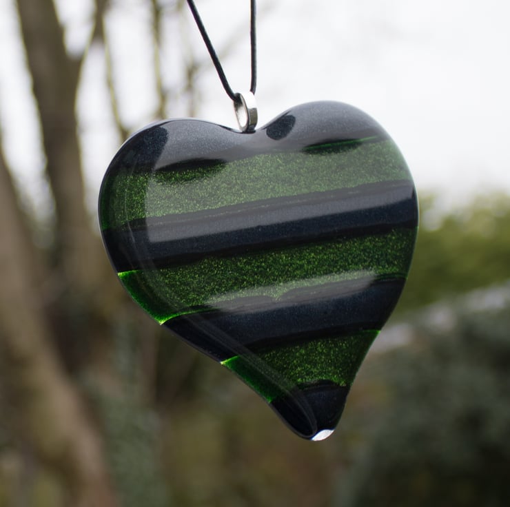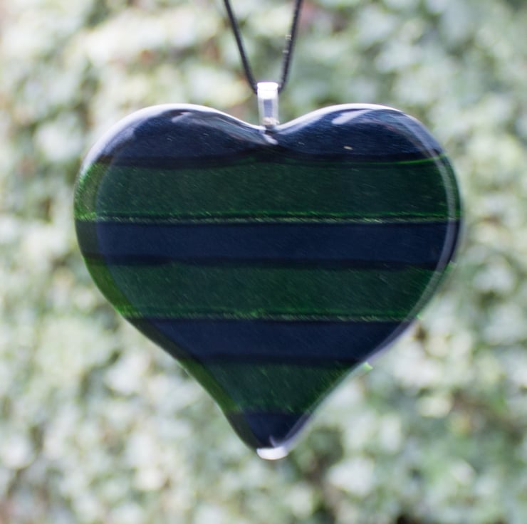 Our first task is to cut our base heart shape from clear glass. We then selected our colours - in this case, sparkly green and blue to make the stripes. These are cut to fit over the clear heart. The whole lot goes into the kiln to fuse everything together. Once cool, we glue on the silver-coloured metal bail and thread the cord.