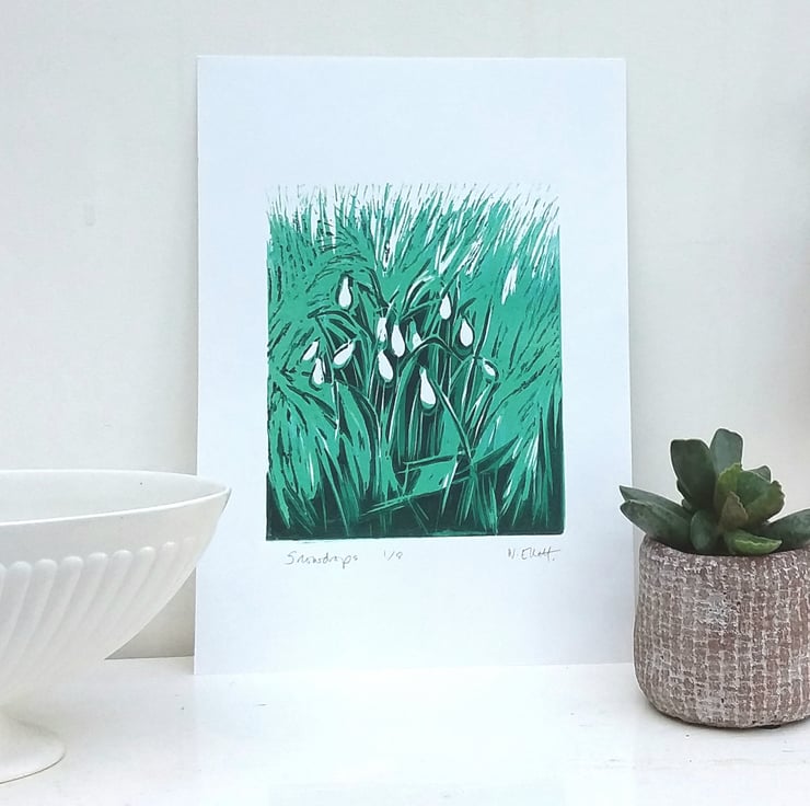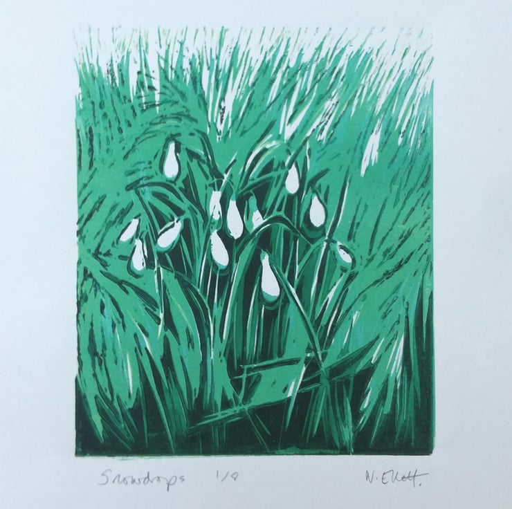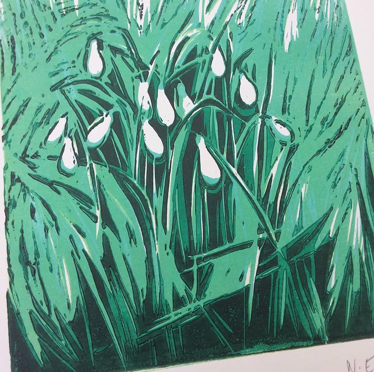 'Snowdrops' - a four layer reduction linoprint in bright greens on white.
