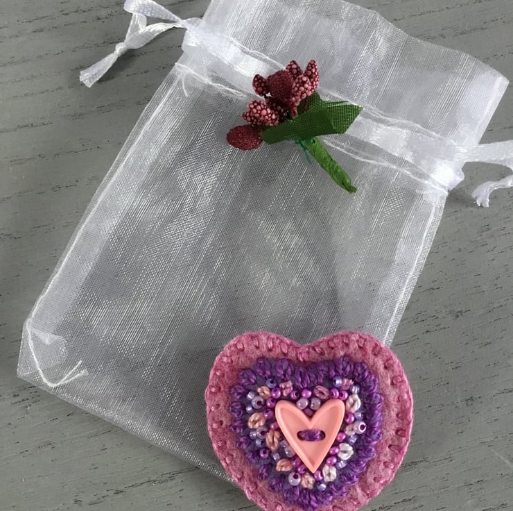 This Hand Embroidered Pink Heart Brooch is gift wrapped in an organza bag decorated with a berry decoration. So it’s ready as a birthday, thank you, friendship gift or Christmas gift. It’s a light gift to post so makes an ideal letterbox gift.
