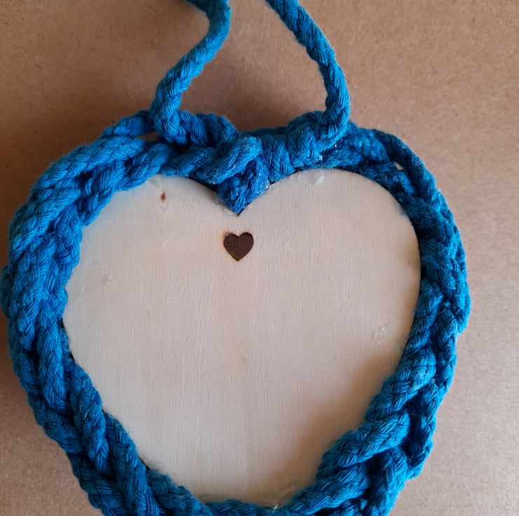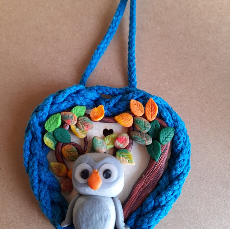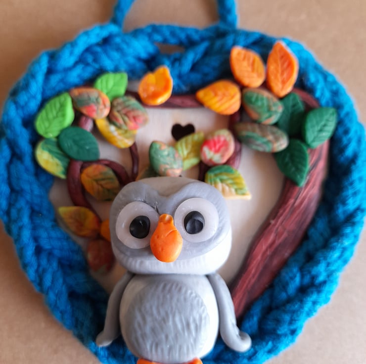 A wooden heart background with a finger knitted surround around the edge. Hand crafted owl and autumn coloured tree made from polymer clay in the centre.