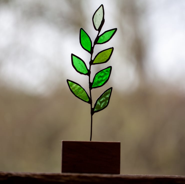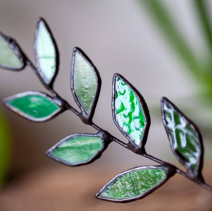 This stained glass ornament has been made from different hues of green glass using the Tiffany technique. Some of the glass has lovely texture. Colours and their order on the vine may vary slightly from pictured ones. It is finished in black patina, polished and set in a piece of waxed oak. Size of leaves varies a little bit - no two are alike! Overall size of the ornament is 21x7.5x4cm (HxWxD)