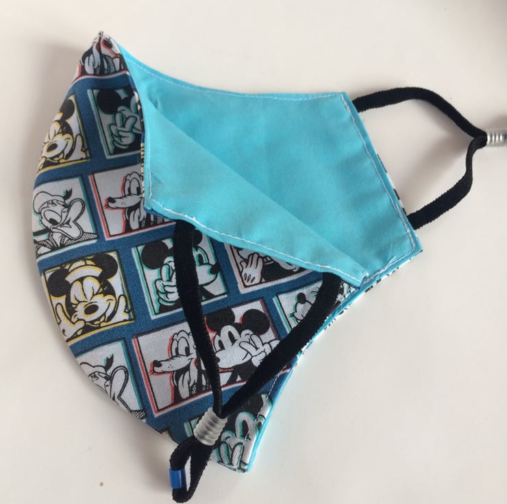 This mask is plain turquoise on one side and has a Disney print on the other.