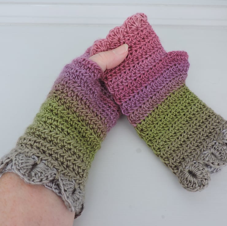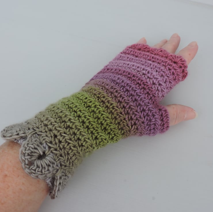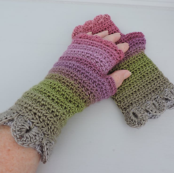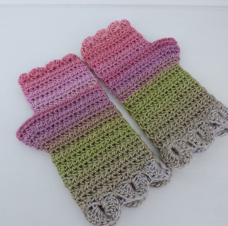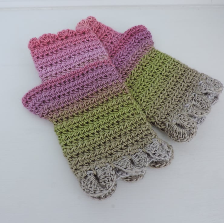 Pretty fingerless mitts which have been crocheted with a 100% premium acrylic multi tonal yarn. Lovely spring colours of pink, grey, green and clover.. A plain body with a single row of dragon scales at the cuffs and a wavy edge to the top.. The perfect winter warmer.
