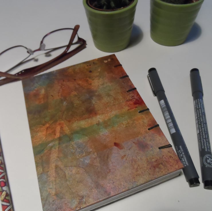 The cover is made with hand painted paper over stiff card.