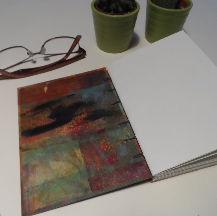 I'm also keen to recycle materials so the pages are recycled from coffee cups and the book cover paper is 'roll off' - the paper I use to roll off spare paint when I'm printing