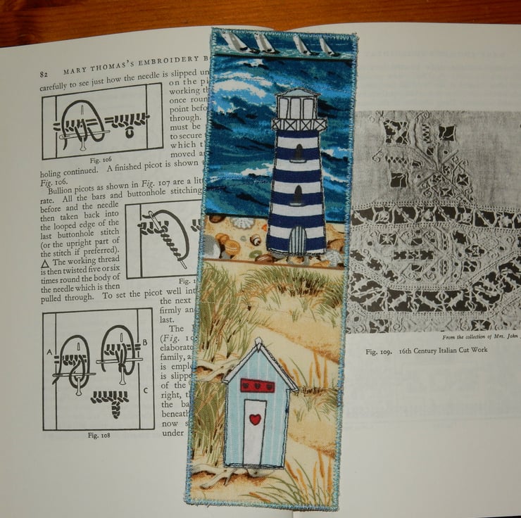 A lovely view of a beach hut on the dunes and a lighthouse in the distance, this bookmark measures 2.5 x 8 inches. It is made from seascape themed fabric, with a beach hut and a lighthouse individually appliqued on. The edge is stitched in matching blue thread.