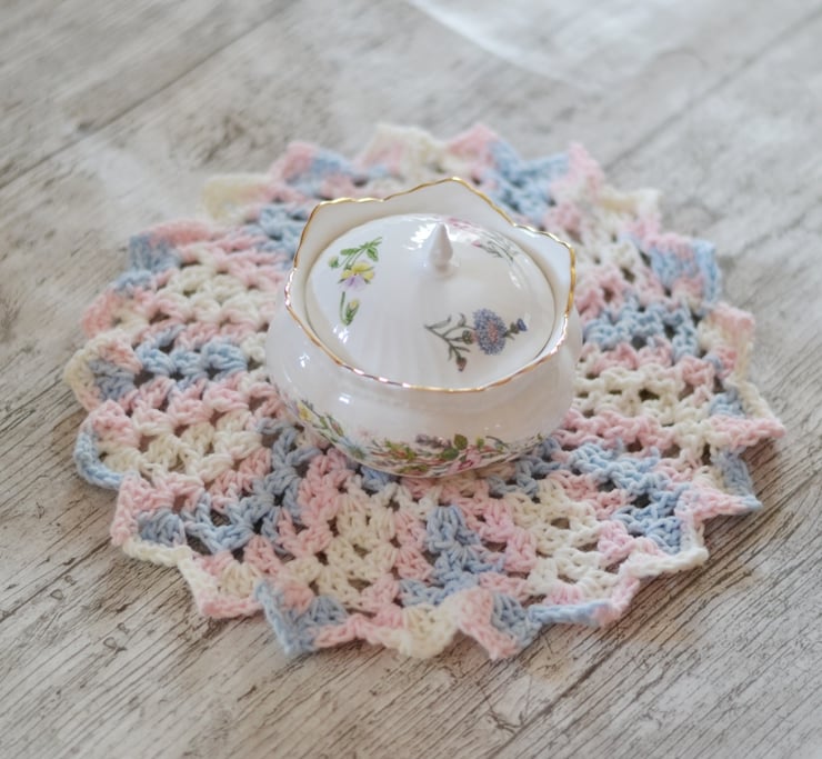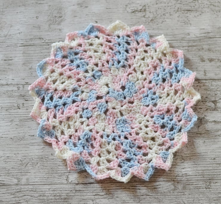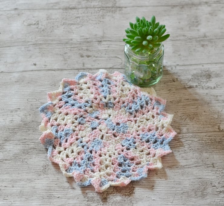 Hand crocheted doily in 100% cotton yarn in a random yarn in shades of pale blue, pale pink and cream. Measures 10" (25.5cm) in diameter. Can be washed and ironed on a low heat. Protects your furniture from being scratched and yet looks lovely. I will be adding a lot more styles and colours once made. If you would like this in a particular colour mesage me.