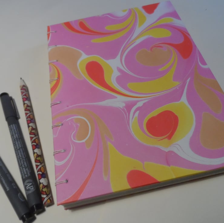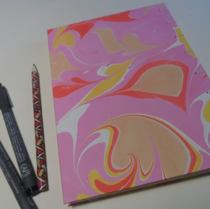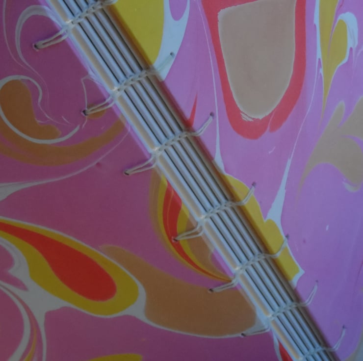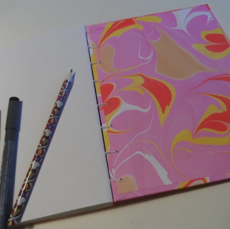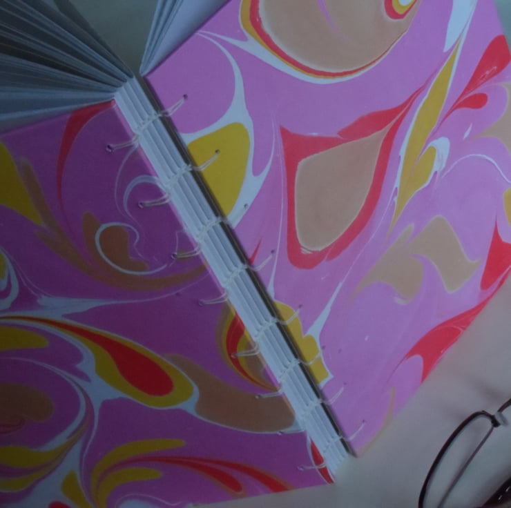 Last summer I had a lovely few days in the garden designing and making marbled papers using fluid acrylics and now I’m using these papers for book covers.