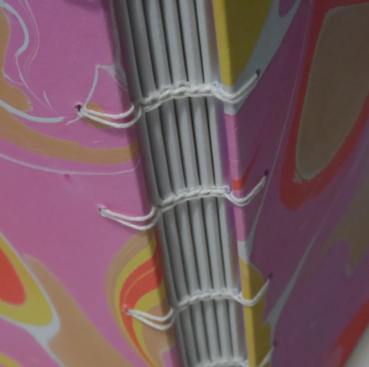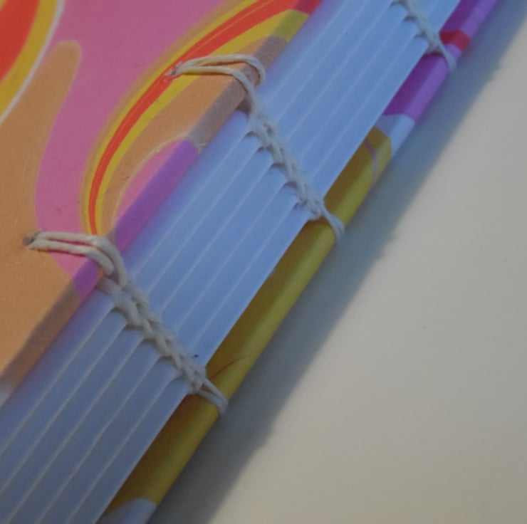This is a handstitched book which I have bound using Coptic stitch and white waxed linen thread. This style of binding (Coptic) allows the pages to open completely flat.