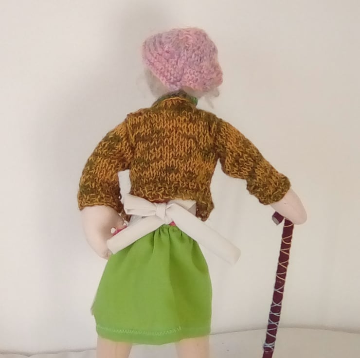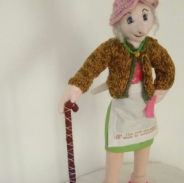 I have made Gladys from my own pattern and numerous fabrics, cotton, felt, wool. Her face has been hand painted and she has tiny seed beads on her eyes. She has wire in her body and legs to enable her to stand and bend. Her walking stick is a plastic shoe horn that I have wrapped in wool and then decorated with multi coloured cotton to remember the NHS.
