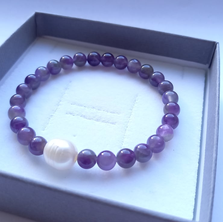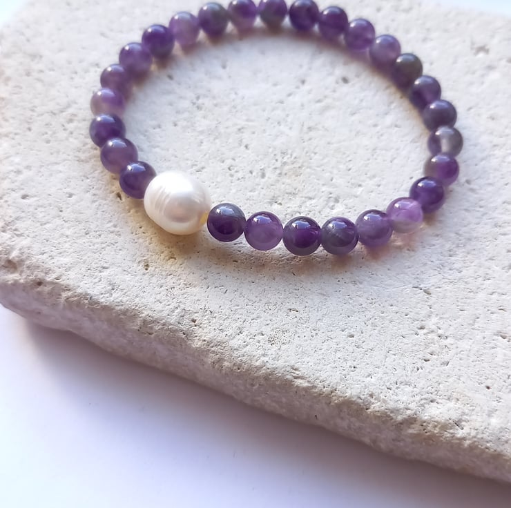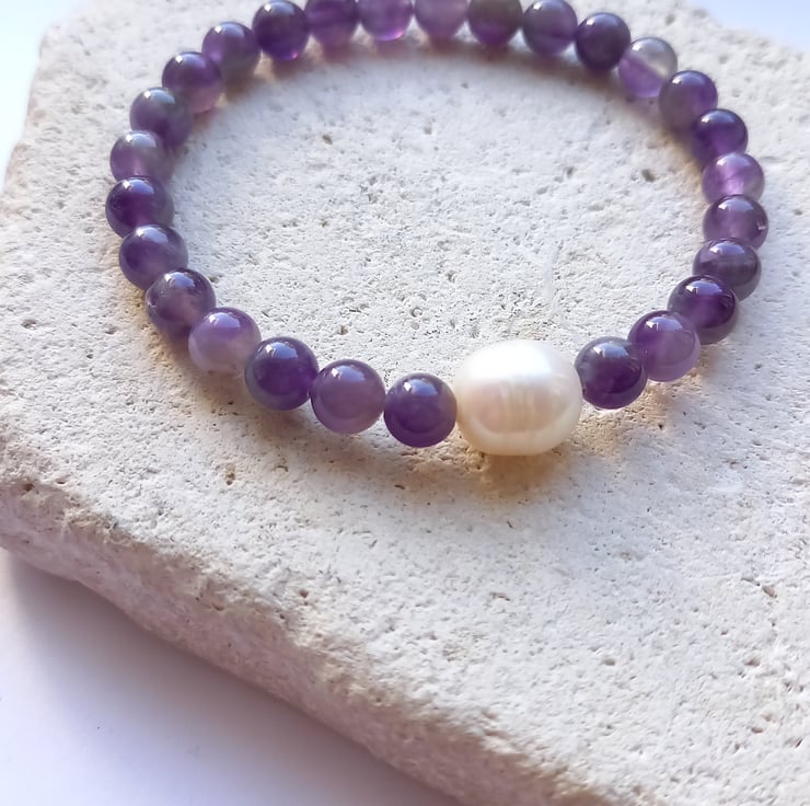 Gorgeous purple amethyst semi-precious bracelet with a freshwater pearl accent.