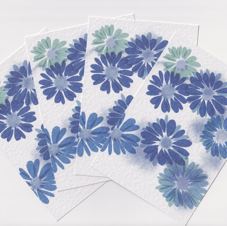 Set of four postcard prints, with Japanese inspired blue floral patterns.