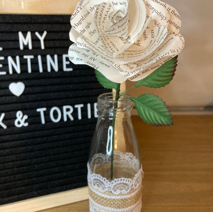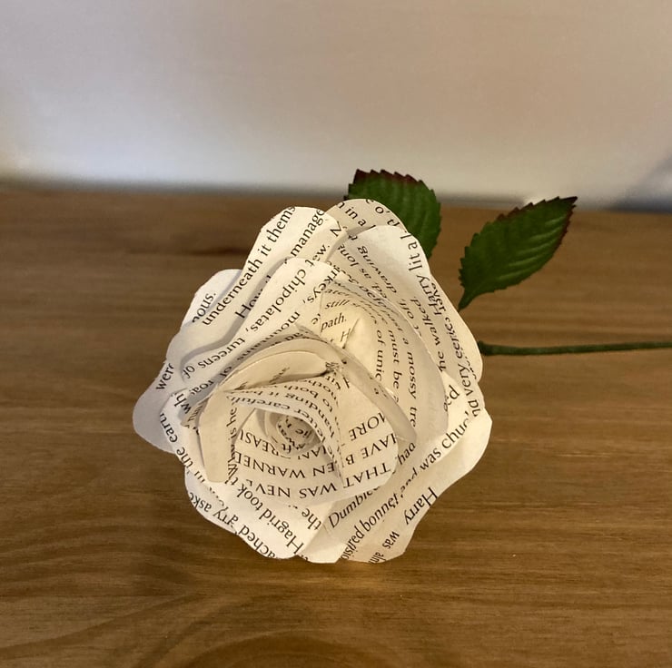 A hand crafted paper rose made from the pages of Harry Potter book. Available with or without a milk bottle vase. Comes with a tag for you to write your own message (or favourite Harry Potter quote).