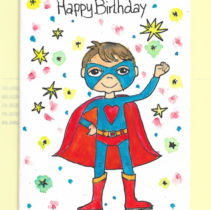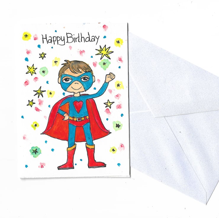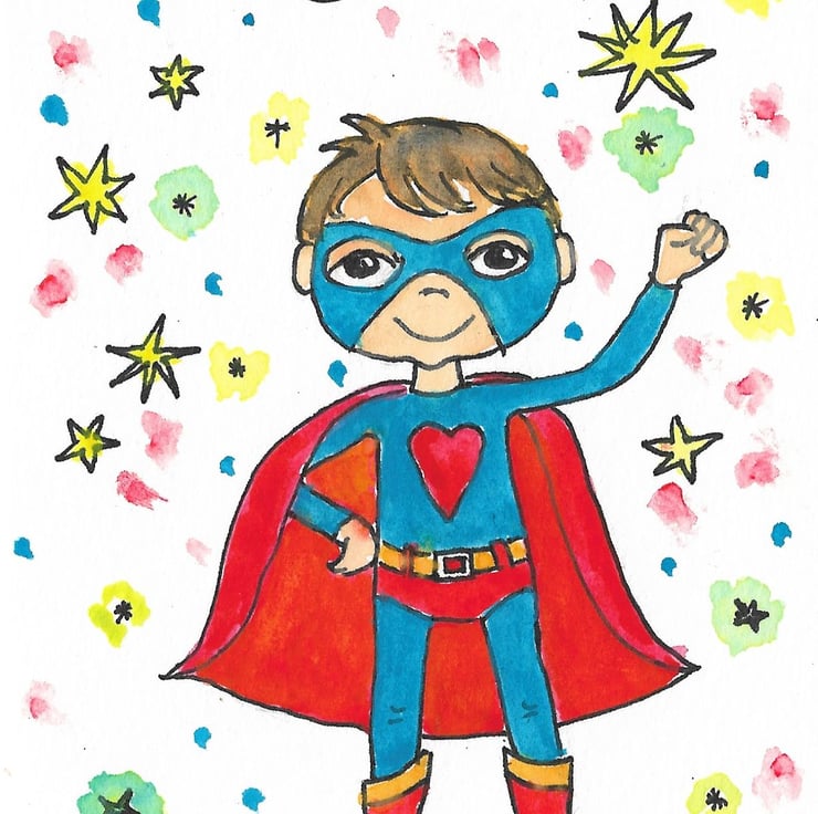 A print of my own original painting of a boy in Super Hero costume. Greeting card. Birthday card.