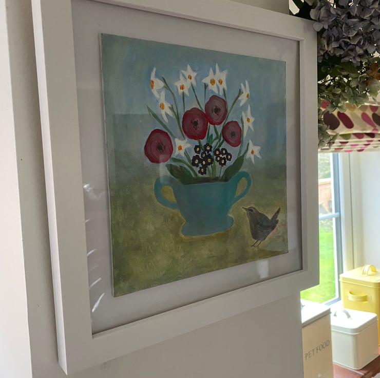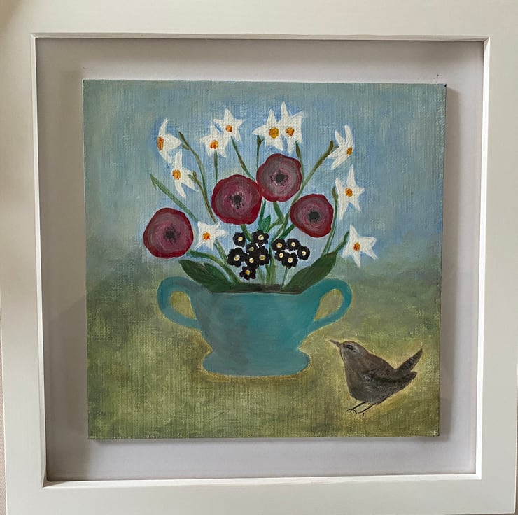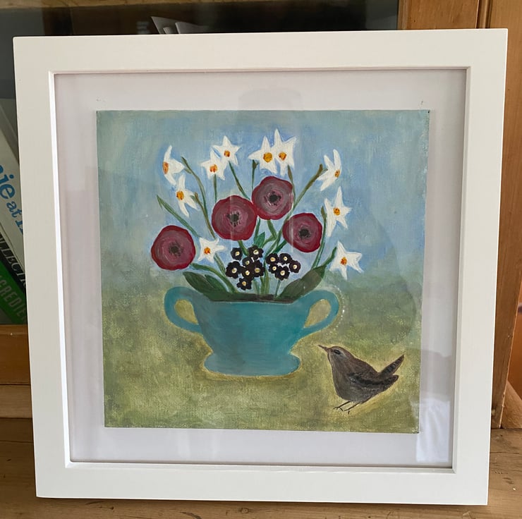 Original signed painting of wren and spring flowers. Framed, signed and gift wrapped.