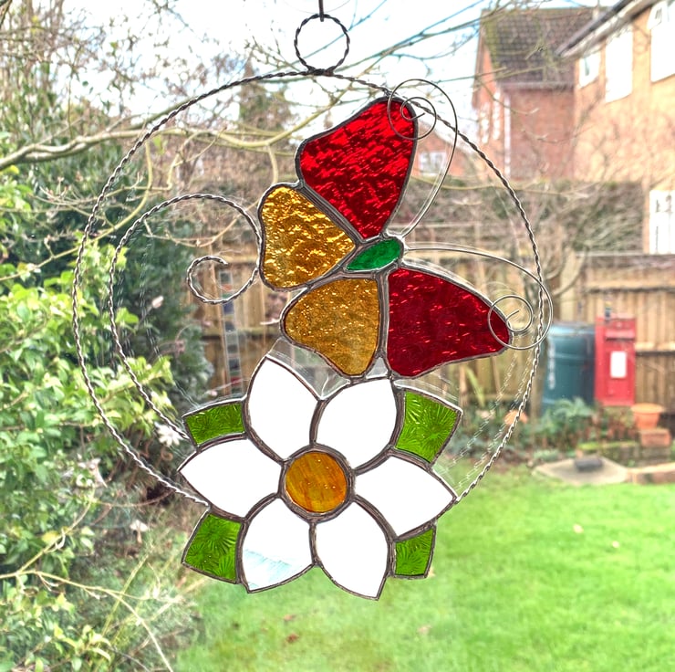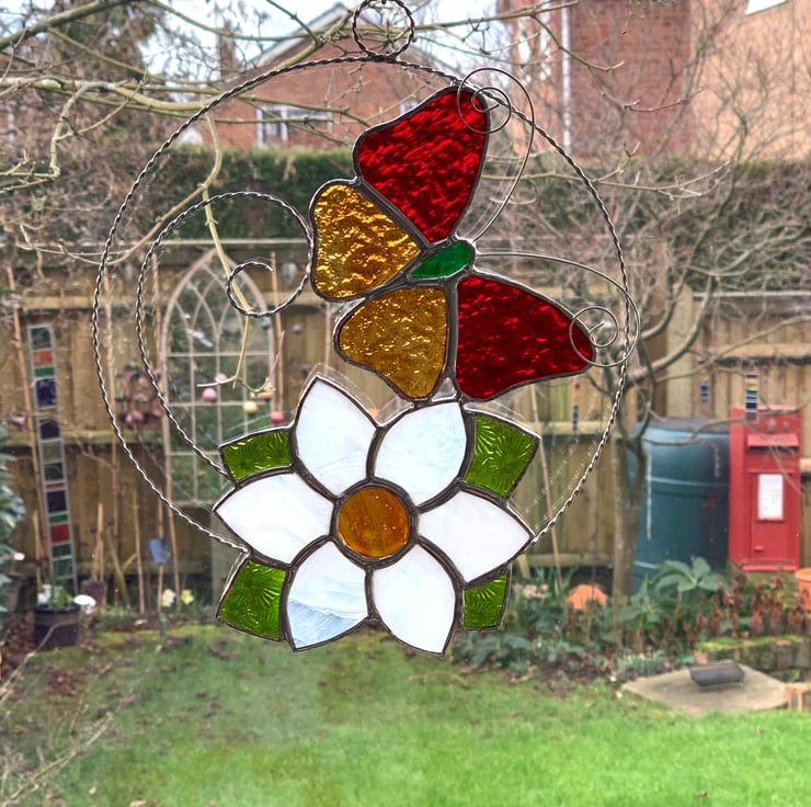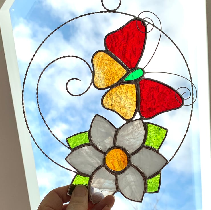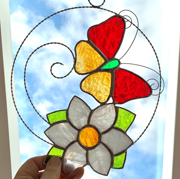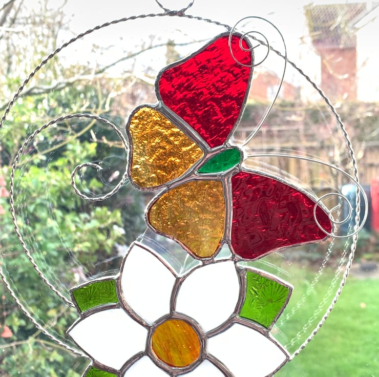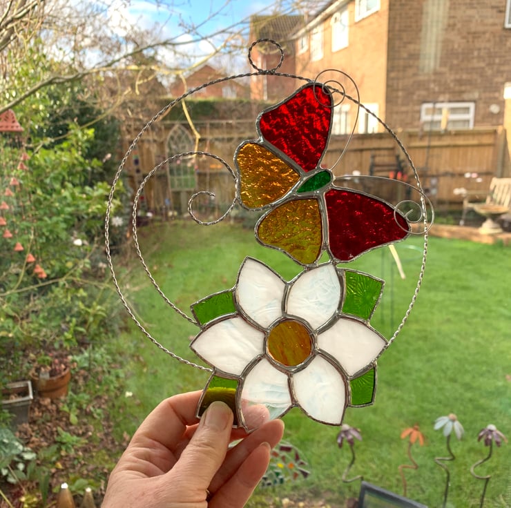 The butterfly has been made from red granite backed glass, two streaky amber glass and green corella glass. Twisted wire for the antenna. The flower has been made from White streaky sea glass with red streaky (orangey) glass and a lovely lime green florentine glass for the leaves. I have used a twisted tinned wire for the circle and scroll to give a little more structure.