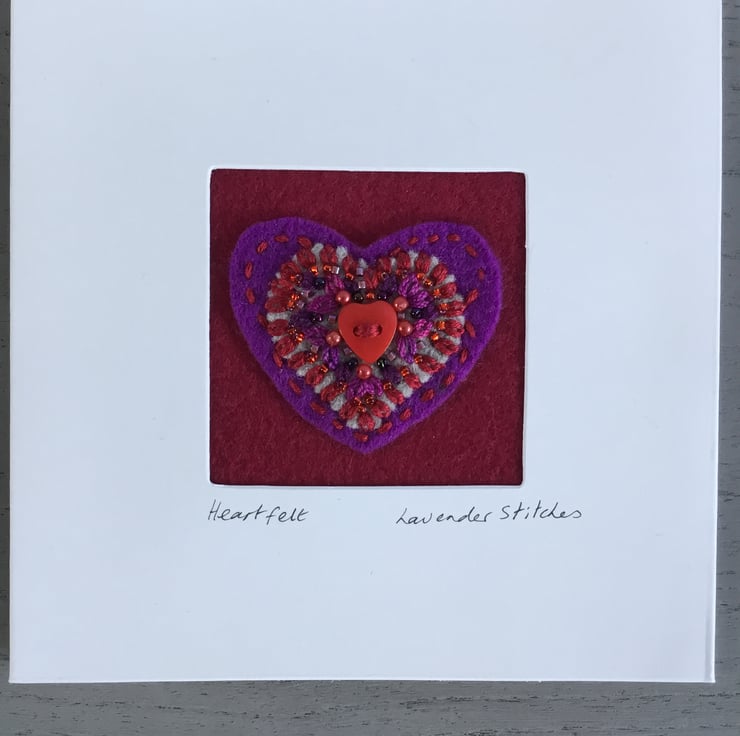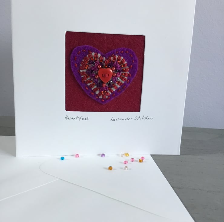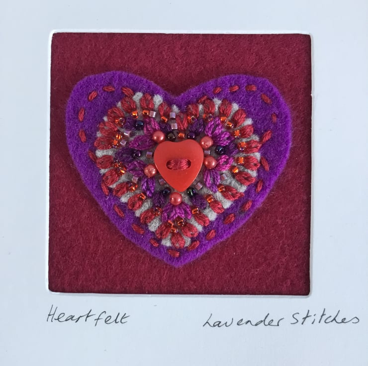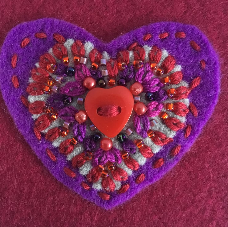 This Embroidered Heartfelt Card has a red heart button stitched onto grey and amethyst felt heart shapes. Hand embroidered Lazy-Daisy and Running Stitches dotted with seed beads in rich ruby, reds, purples and dark pink colours, surround the red heart button. This embroidered heart is stitched onto a background of dark ruby red felt.