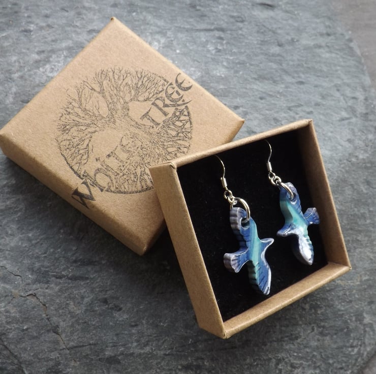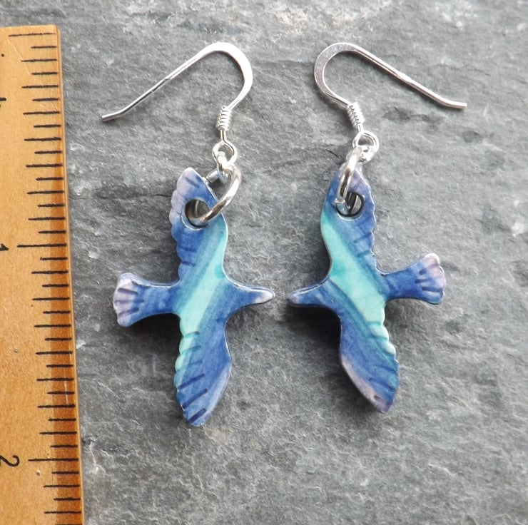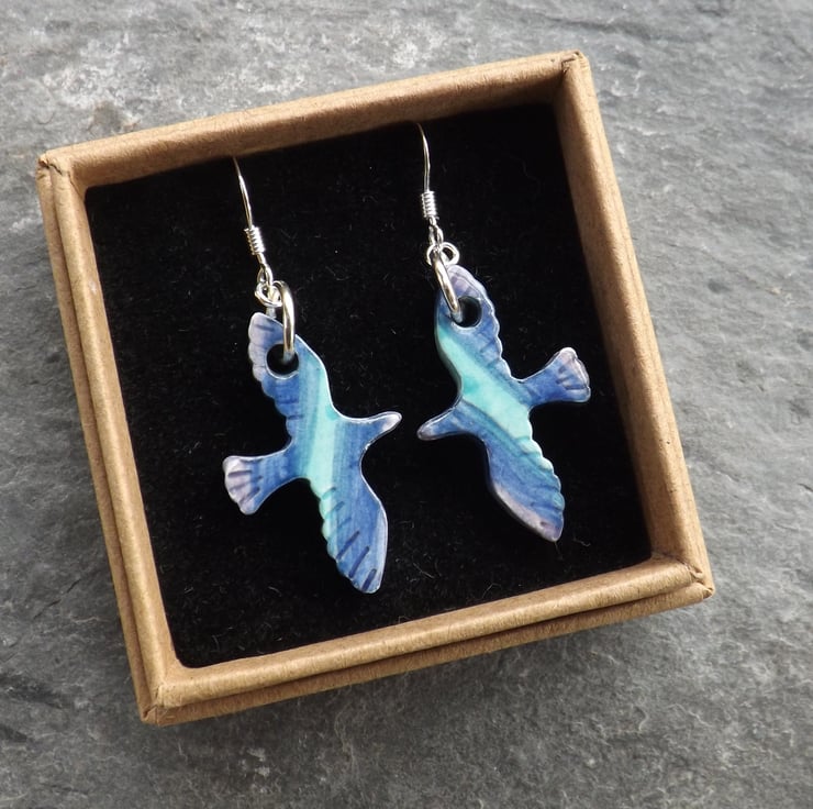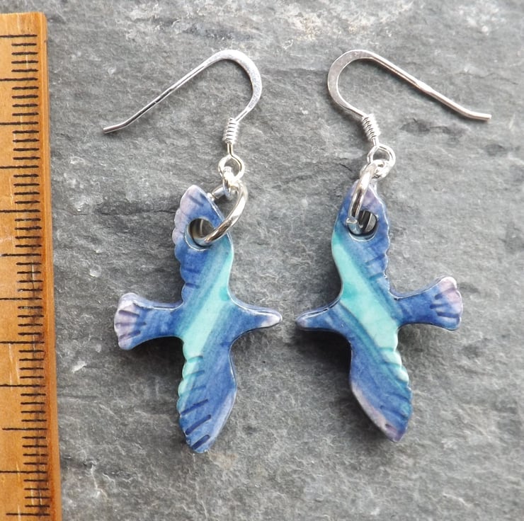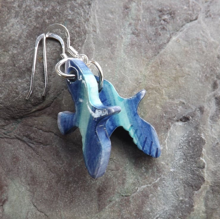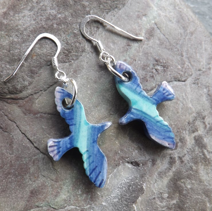 I cut the small bird shapes out of fine white clay, and when dry I carefully smooth all the edges. They then have their first firing. Next I paint them using under-glazes. The birds are painted on both sides and the edges. I then apply a transparent glaze before firing again to earthenware. The ceramic is glazed all over so is very smooth to the touch, the result is a pleasantly tactile item. After the second firing I suspend the birds from silver plated rings, and attach sterling silver ear wires.