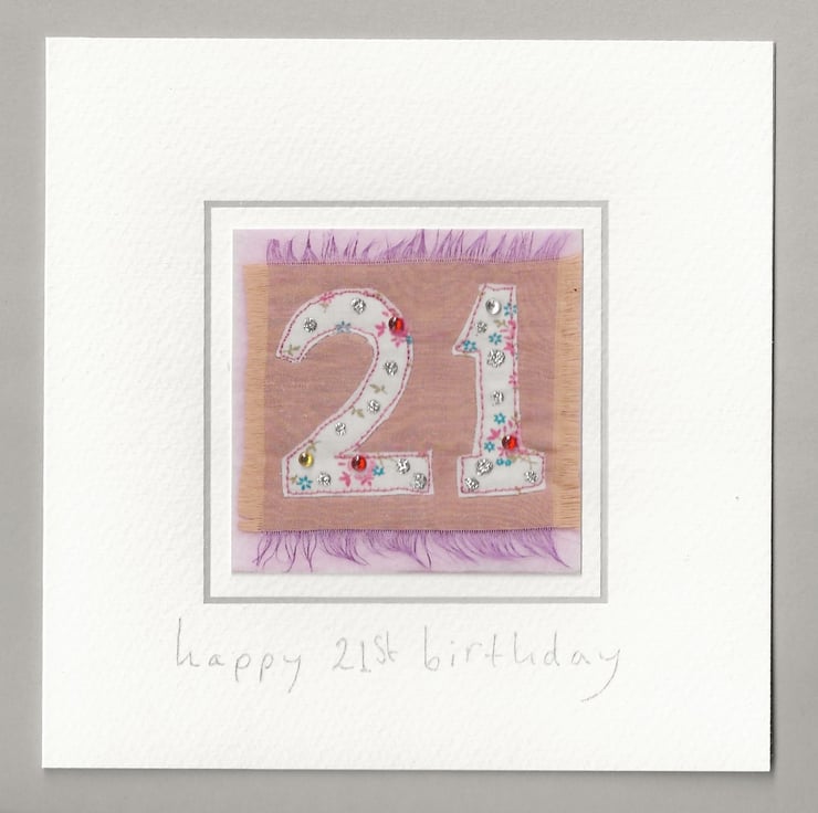 A pretty lilac and blush pink floral 21st birthday card, designed and created by the artist Suzanne Hooson, using free machine embroidery and beautiful layered fabrics, printed and hand finished with glitter for an extra sparkle.