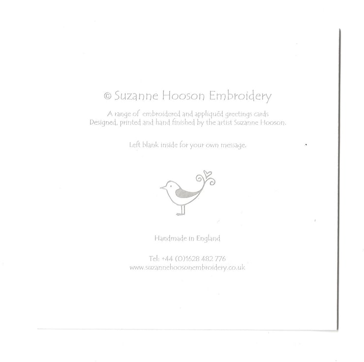hello thank you for visiting my folksy shop. All my cards are printed from an original embroidered design created by myself and can be personalised if you choose, with a name, date or a greeting of your choice, handwritten in silver.