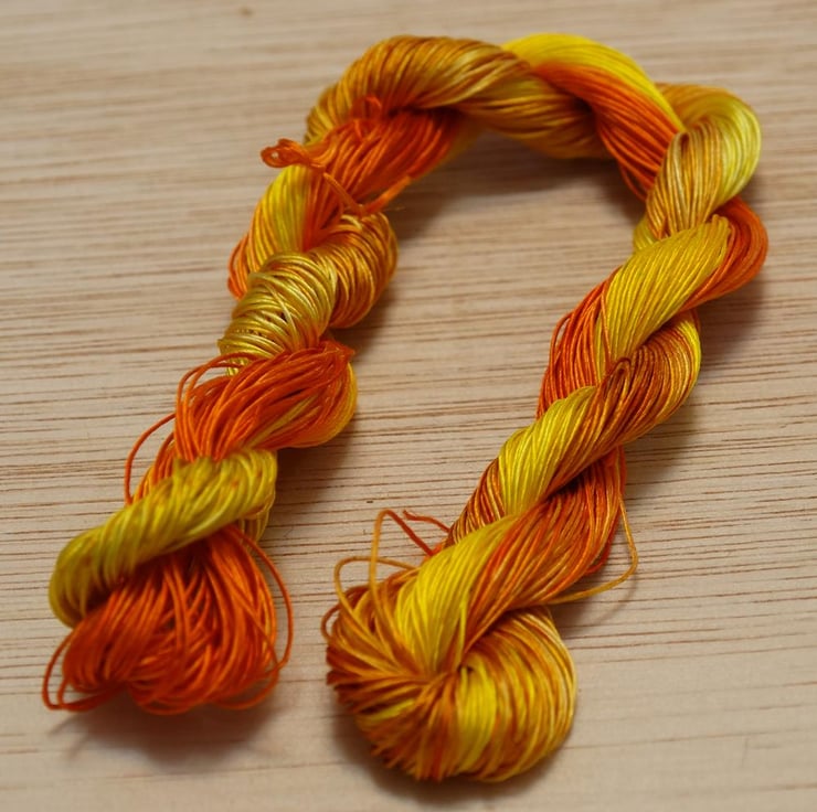 The colours cycle in the order of yellow, bright yellow, orange, sandy yellow (this may be reversed and/or start on a different colour on individual bobbins) with roughly 4 inches of each colour at a time, but as this is handdyed, this isn't an exact measurement.