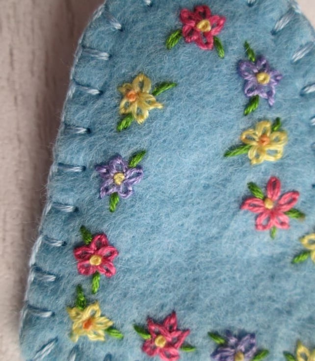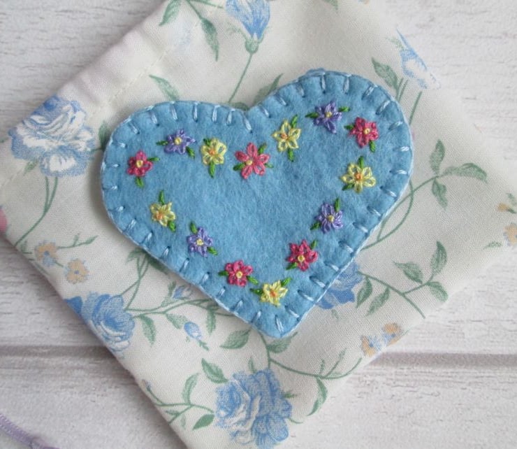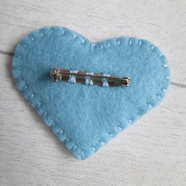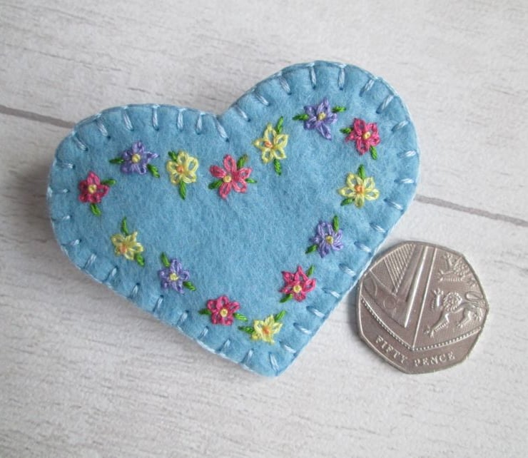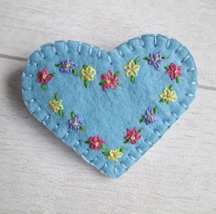 Even though my garden is currently January grey and rather muddy, there are glimpses of new life and colour to come as the leaves of bulbs begin to appear. So, looking ahead to warmer days, I've taken a sky blue, wool felt heart and hand embroidered it with tiny primulas in shades of rose pink, lemon yellow and pale lavender, before turning into a dainty brooch. Edged with blanket stitch and fitted with a metal brooch clasp on the back, it's sure to brighten the greyest of days.
