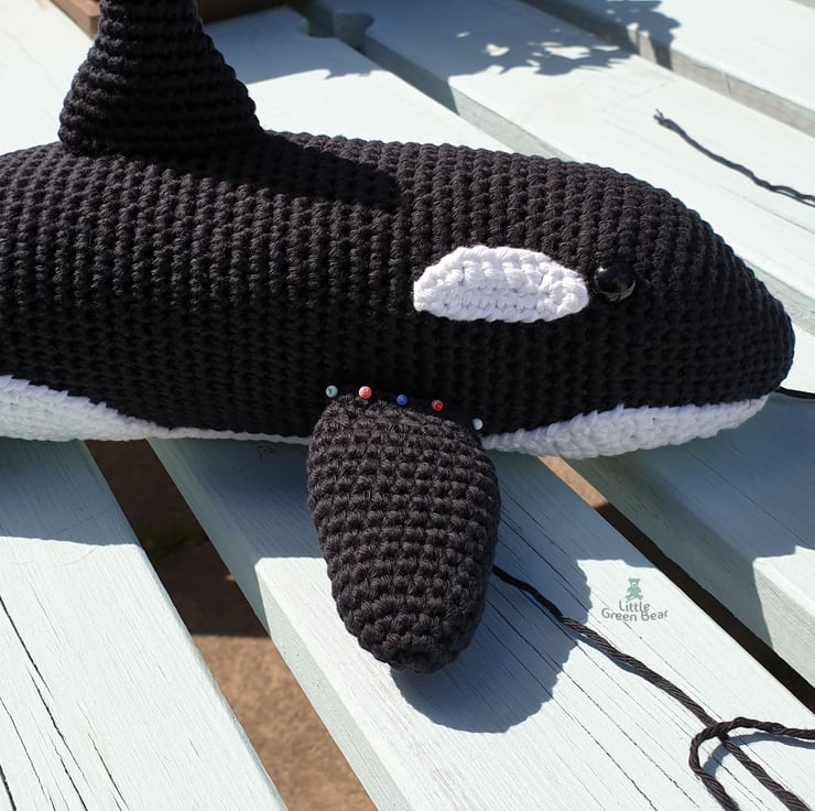 Olwyn the little orca spends her days cruising round with her large pod, saving her energy for hunting time. She’s always hungry and keeping an eye out for a tasty squid. She is 16 inches long (when made with the recommended materials).