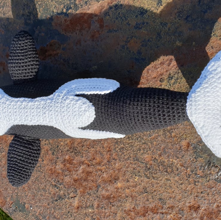 Olwyn the little orca spends her days cruising round with her large pod, saving her energy for hunting time. She’s always hungry and keeping an eye out for a tasty squid. She is 16 inches long (when made with the recommended materials).