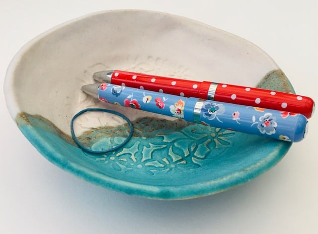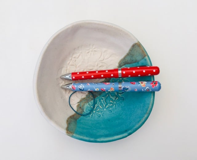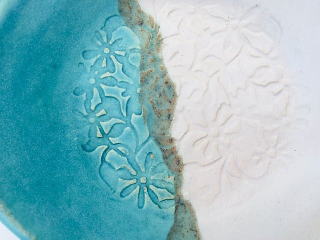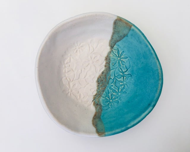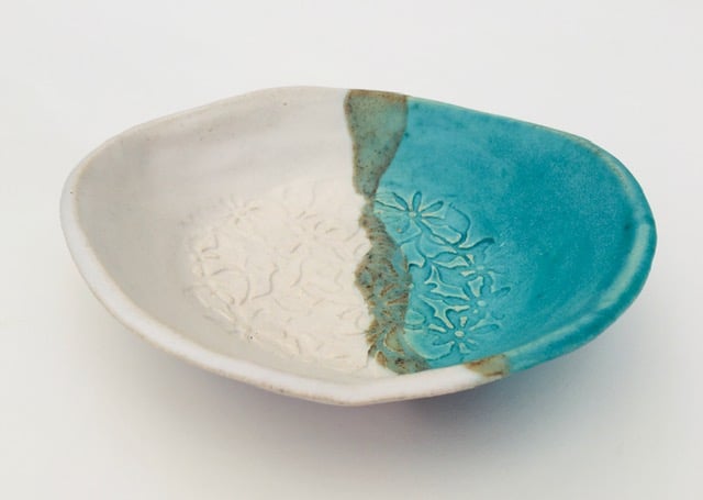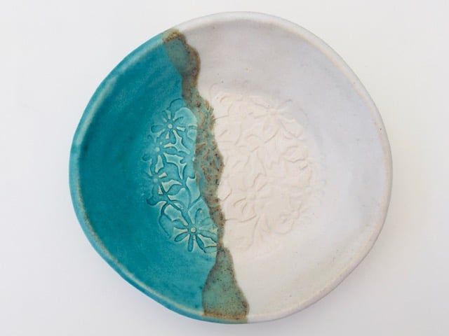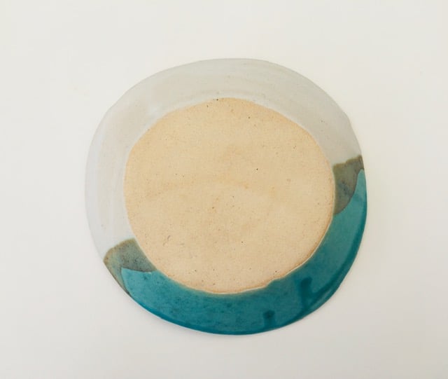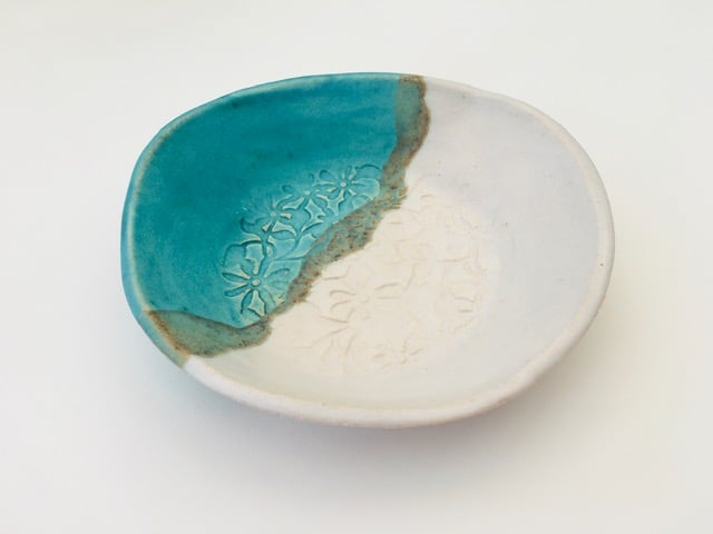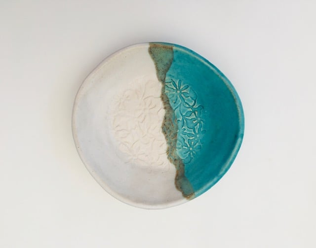 It is glazed with a lovely pure white glaze and turquoise glaze. The glaze is overlapped to create this bespoke design. Each glaze is one of my secret recipes.