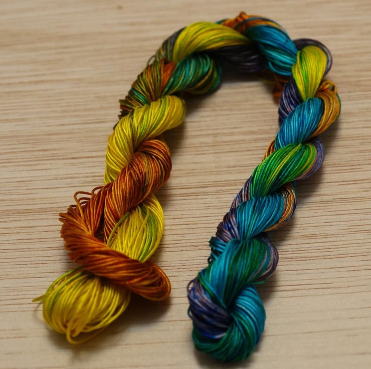 This embroidery thread is made from of 100% Silk and has been handdyed to create a colourful and variegated thread. It is perfect for any form of embroidery including cross-stitch, blackwork and free-hand embroidery. It will be sent already wound onto a bobbin.