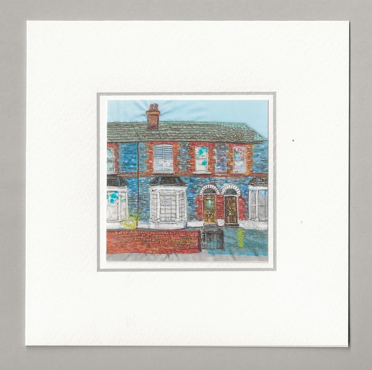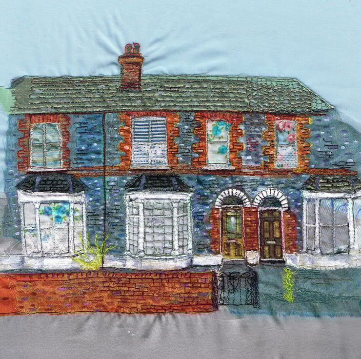 Sophie's home handmade card is printed from a commission I created of my lovely friend Sophie's house, it is created using beautiful layered fabrics and free machine embroidery, I have also used acrylic paints to add in the finer details. This would make the perfect new home card and can also be personalised.