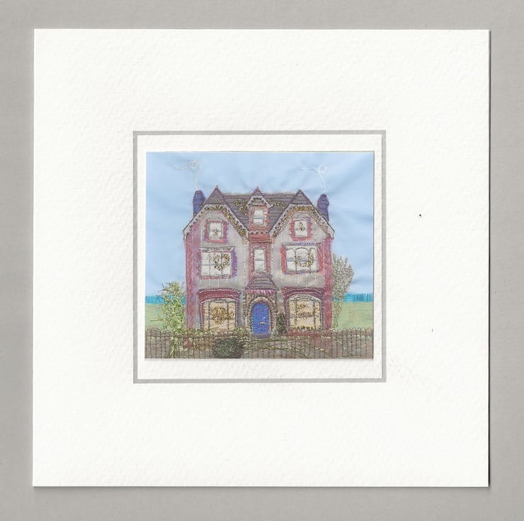 This beautiful three storey town house card is taken from an actual embroidered commission by the artist Suzanne Hooson. It is created using layered fabrics and free machine embroidery and paint. This could be the perfect new home card for someone special and can also be personalised.