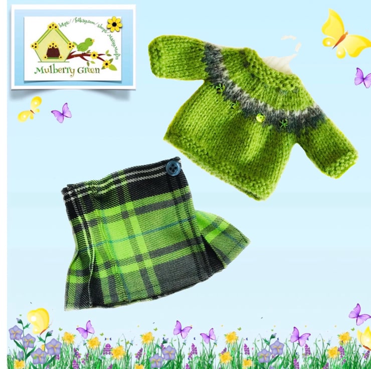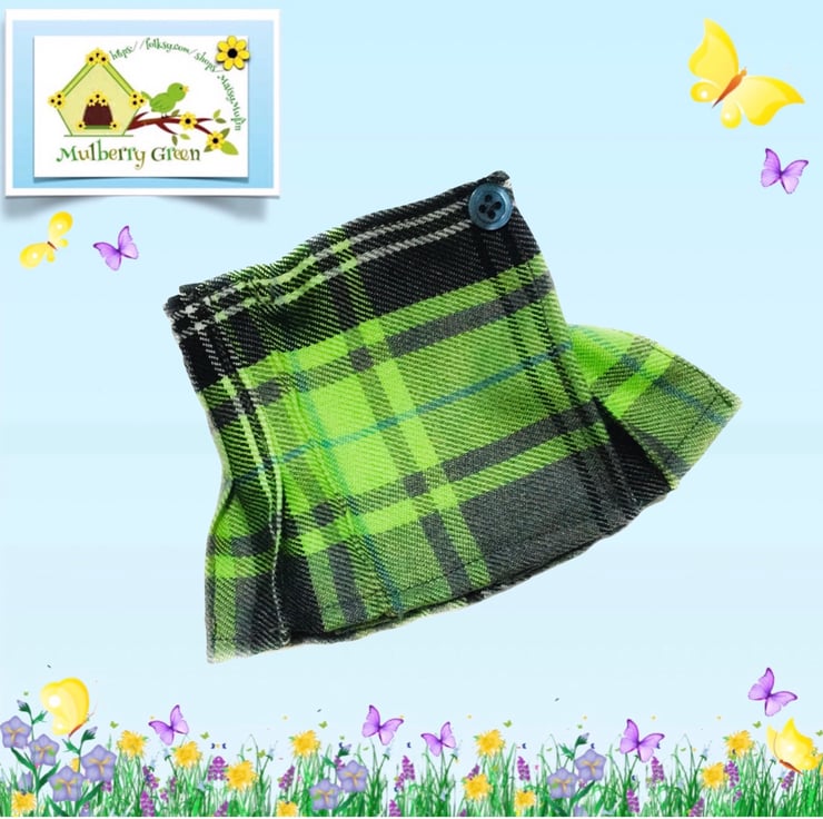 A lovely little hand pleated tartan kilt fit the Mulberry Green characters, in a lovely line green and grey tartan. It matches the green fair isle jumper.