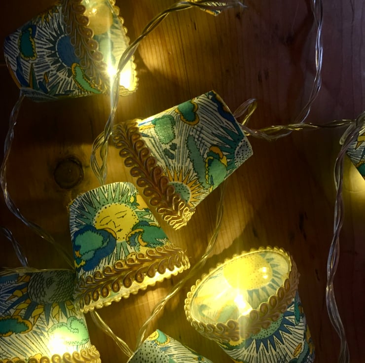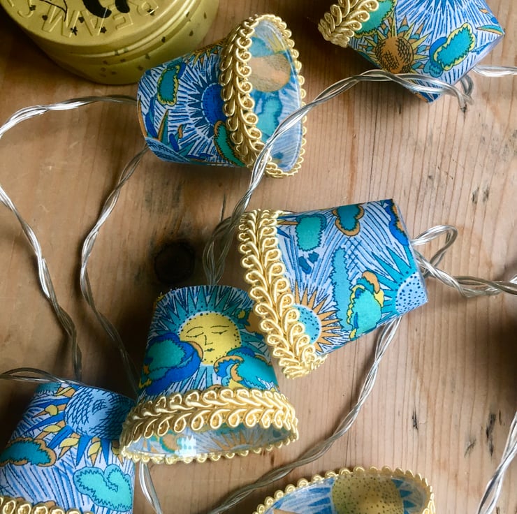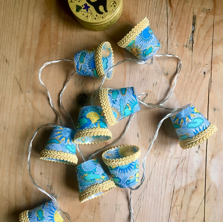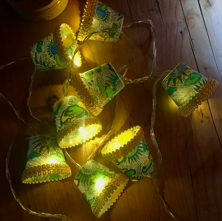 These mini lampshades are perfect to drape along a mantlepiece or shelf, around the head of a bed, or strung across a mirror or picture frame.