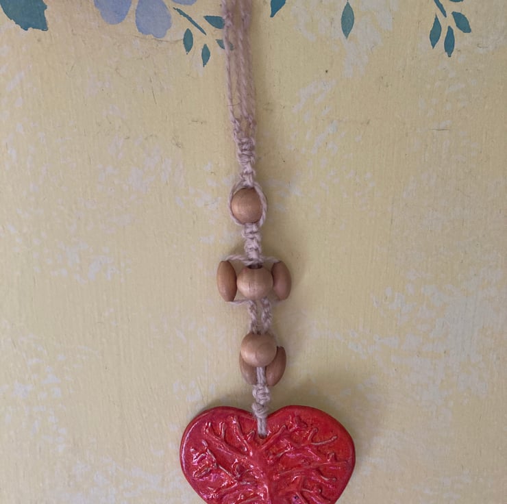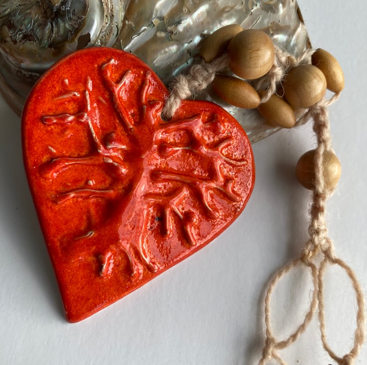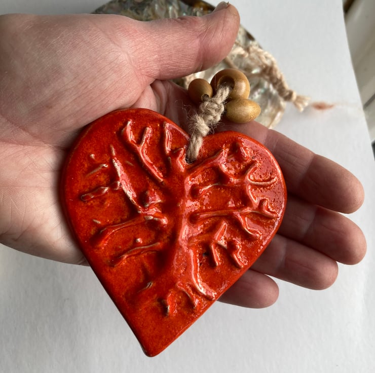 Handmade ceramic heart with tree of life raised detail , glazed on one side in flame red earthenware.