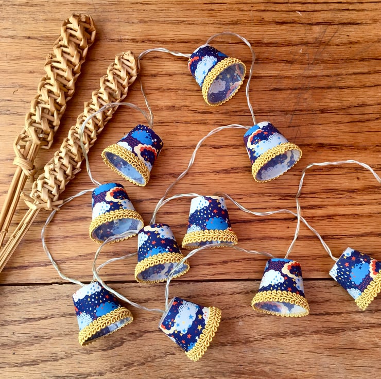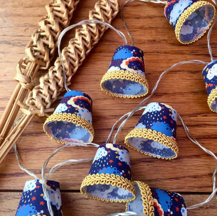 These mini lampshades are perfect to drape along a mantlepiece or shelf, around the head of a bed, or strung across a mirror or picture frame.